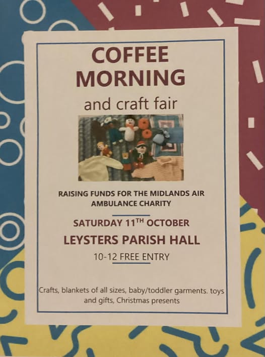Coffee Morning and Craft Fair Fundraiser for Midlands Air Ambulance- Leysters Parish Hall Date: Sat 11th Oct Time: 10:00