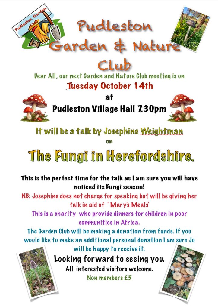 Pudleston Garden & Nature Talk – The Fungi in Herefordshire, Josephine Weightman – Pudlestone Village Hall Date: Tue 14th Oct Time: 19:30